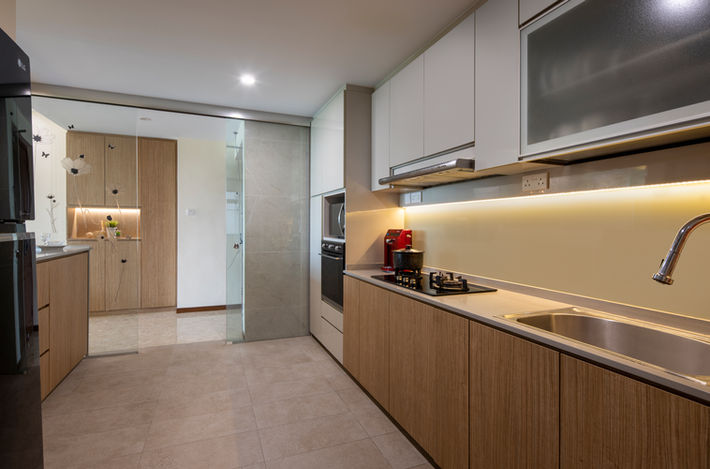 The kitchen has a sleek two-tone design with wood base cabinets and matte white uppers. Under-cabinet lighting highlights the long, practical counter. The glass sliding door keeps the layout open yet functional, blending warmth with modern efficiency