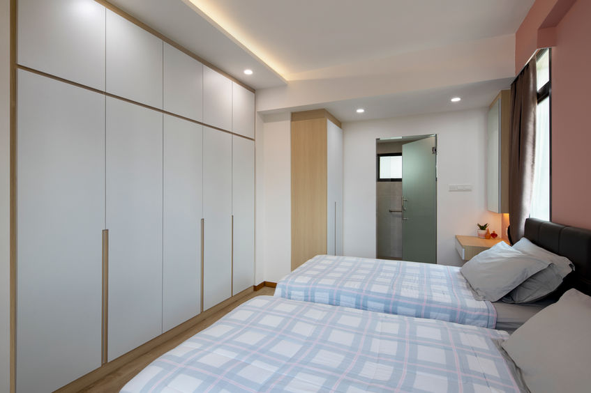 Minimalist yet cosy, with built-in wardrobes stretching to the ceiling for maximum storage. Subtle lighting above the wardrobes softens the space, while patterned bedding and soft toys add a personal, homely touch.