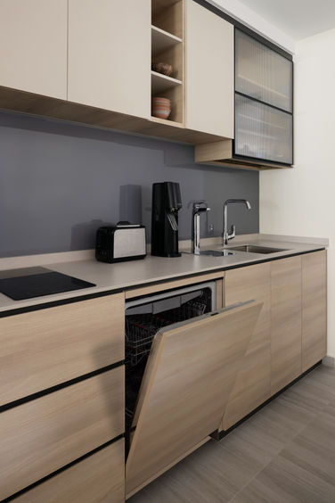 Storage is cleverly integrated with seamless drawers and hidden appliances, including a built-in oven and dishwasher, keeping the lines clean and clutter-free.