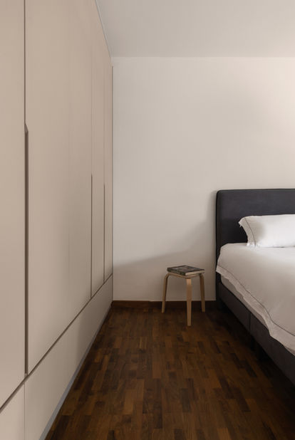 Built-in wardrobes with clean, flush panels keep the bedroom clutter-free, while neutral tones enhance a restful atmosphere. Sliding doors save space and lead smoothly into the ensuite, where warm lighting softens the look of modern fixtures. Floating cabinetry by the window adds storage without crowding the floor, paired with timber flooring that grounds the space in warmth and comfort.