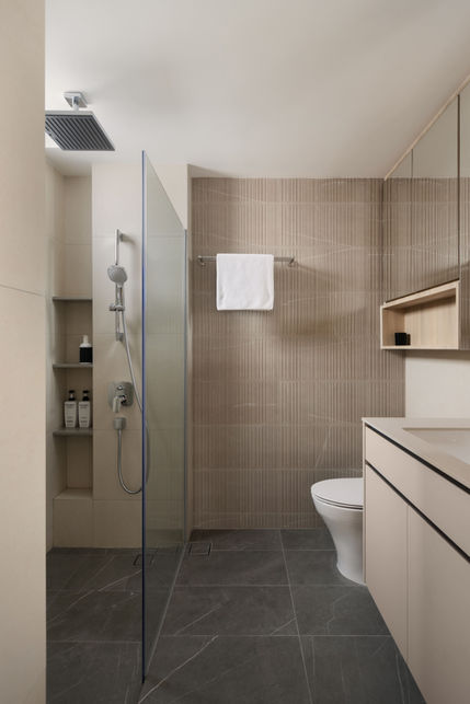 Sleek and contemporary, designed around clean lines and warm neutrals. Soft beige wall tiles paired with dark stone flooring create a calm, balanced contrast. A glass-enclosed shower keeps the layout open, while recessed shelving adds practicality without clutter. The vanity, finished in light wood with underlit mirrors, offers both storage and a touch of luxury.