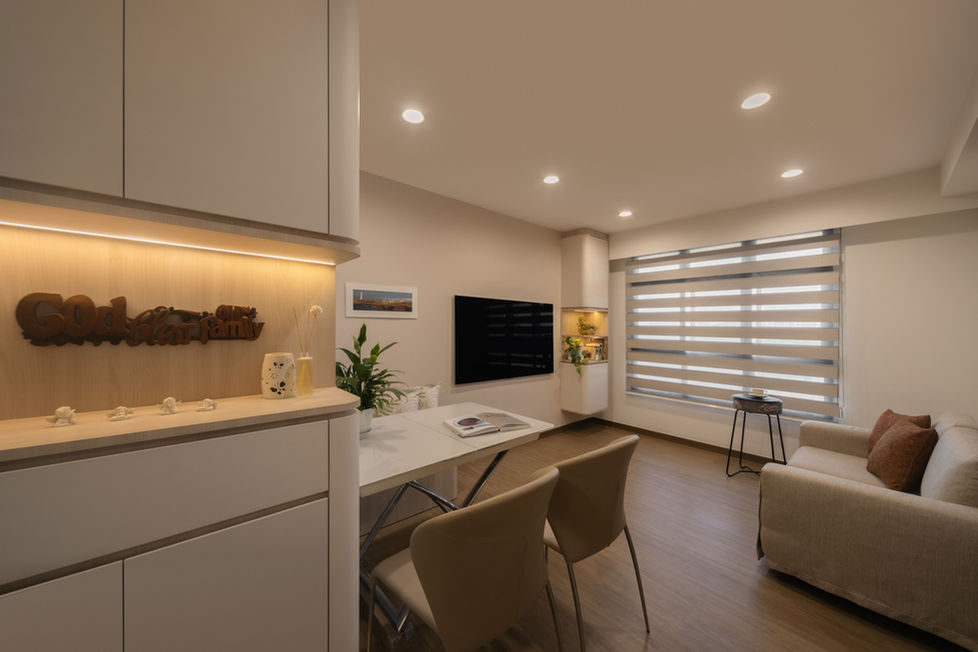 This living room is designed with a warm, minimalist touch — light wood panels and soft neutrals create a calm, cohesive look. Built-in cabinets hide storage neatly, while open shelves with soft lighting add character and warmth. The dining and living areas flow seamlessly, with a wall-mounted TV, built-in bench and compact furniture maximising space.