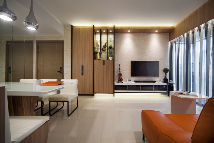 Light wood panels with black framing create clean lines, while a textured stone wall adds depth. The orange leather sofa brings a bold accent against neutral tones. Glass shelves and hidden cabinetry balance display and storage, keeping the area tidy. Pendant lights and soft cove lighting add sophistication, while large windows with sheer curtains keep the room bright
